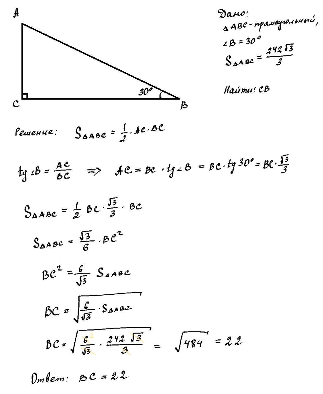 Площадь прямоугольника треугольника равна 242 корень из 3 и делить на 3. Один из острых углов 30 градусов. Найдите длину катета, прилежащего к этому углу. С подробным решением.