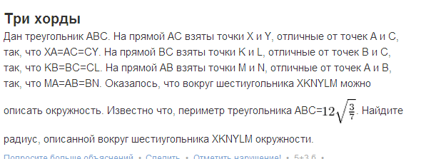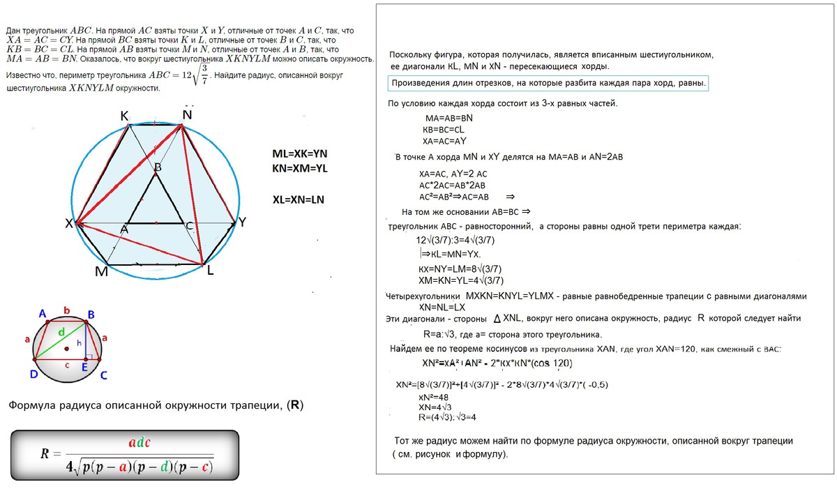 Оказалось, что вокруг шестиугольника XKNYLM можно описать окружность. Известно, что периметр треугольника ABC=12√(3/7). Найдите радиус описанной вокруг шестиугольника XKNYLM окружности