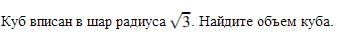 По условию: диагональ куба,это диаметр шара, получается,диагональ куба равена 2√3. Если сторона куба a, то a√3=2√3, следовательно,сторона куба 2. Отсюда: V куба= 2^3=8