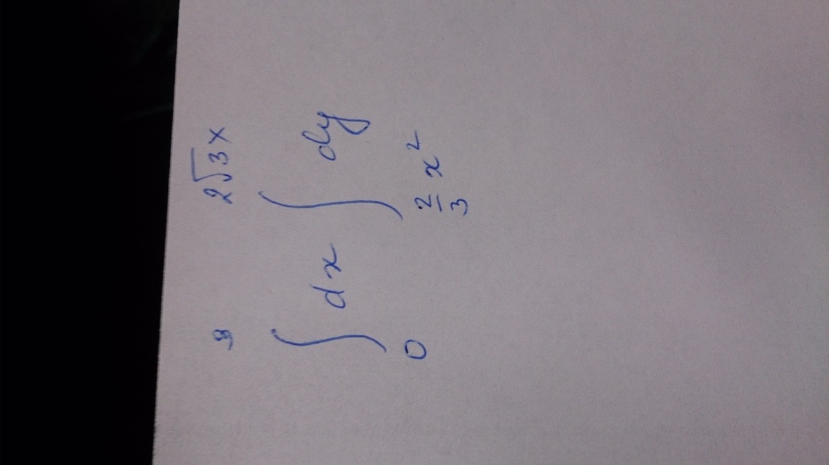 int _0^3, dxint !_{!frac{2}{3}x^2}^{!2sqrt3x}, dy=int _0^3dx(y, |_{frac{2}{3}x^2}^{!2sqrt3x})=int _0^3(2sqrt3x-frac{2}{3}x^2)dx=\\=(2sqrt3cdot frac{x^2}{2}-frac{2}{3}cdot frac{x^3}{3})|_0^3=(sqrt3x^2-frac{2x^3}{9})|_0^3=9sqrt3-6=3(3sqrt3-2)