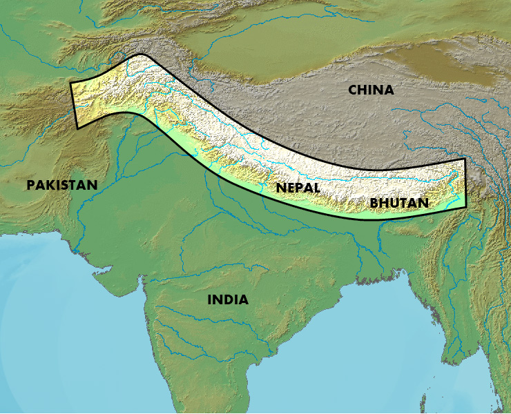 В настоящее время Гималаи признаны самой высокой в мире горной системой. Она отделяет полуостров Индостан от остальной Азии. Всего в цепи насчитывается 109 вершин, большая часть из которых достигает высоты 7300 м над уровнем моря. Самая высокая вершина Гималаев — Эверест. Система Гималаев, около 2400 километров в длину и различная по ширине от 240 до 330 километров, состоит из трех параллельных хребтов - Больших Гималаев, Малых Гималаев, Предгималаев - иногда под общим названием хребта Гималаев.