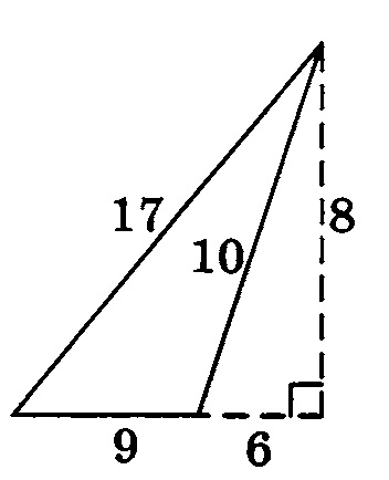 Решал по формуле Герона, хотя ваш рисунок напрашивается на вычитание площади самого правого треугольника из самого большого)