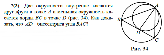 Окружности касаются внутренним образом. A - общая точка. Она лежит на линии, соединяющей центры двух окружностей. В точке A у них будет общая касательная. Касательная перпенд радиусу, проведенному в точку касания