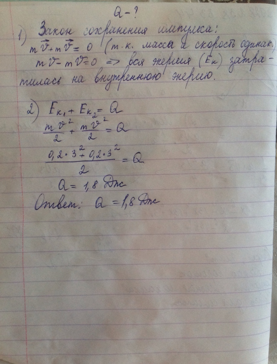 Два одинаковых шара массой 0,2 кг летят навстречу друг другу с одинаковыми скоростями 3м/с . Найти кол-во теплоты, которое выделится при абсолютно неупругом центральном ударе шаров.