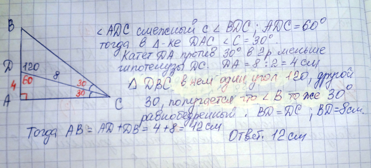 Биссектриса CD прямоугольного треугольника АВС с гипотенузой ВС равна 8 см. Найдите АВ, если угол BDC=120 градусов
