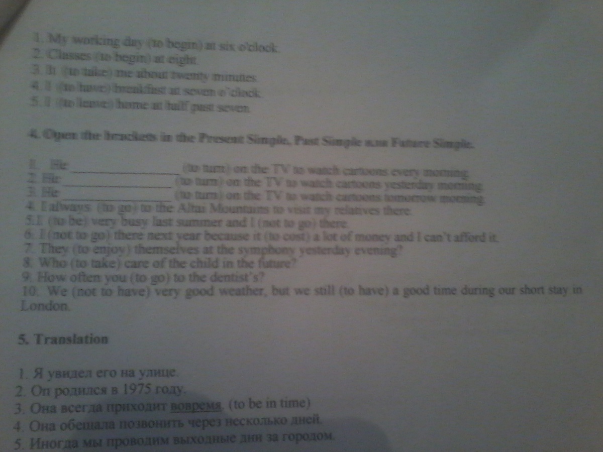 1) begins; 2) begin: 3) takes; 4) have; 5) leave.