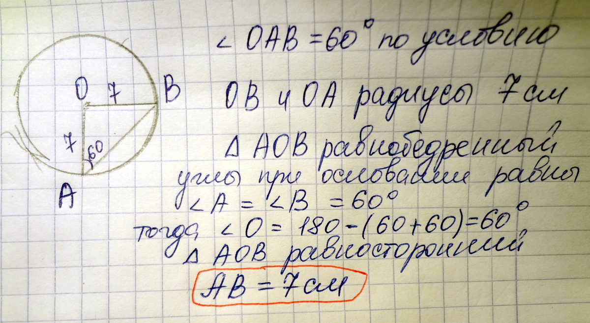 Центральный угол AOB опирается на хорду AB так, что угол OAB равен 60. Найдите длину хорды AB, если радиус окружности равен 7.