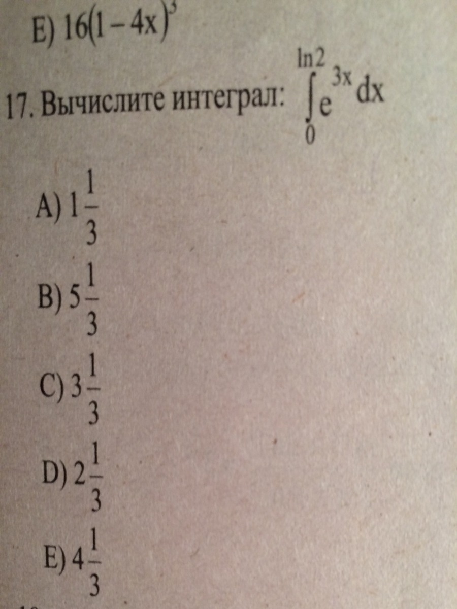 intlimits^{ln2}_0 {e ^{3x} } , dx= frac{1}{3} intlimits^{ln2}_0 {e ^{3x} } , d(3x)= frac{1}{3}e ^{3x}|_0^{ln2}= \ =  =frac{1}{3}(e ^{3ln2}-e ^{3cdot 0})=  frac{1}{3}(e ^{ln2 ^{3} }-e ^{0})= frac{1}{3}(8-1 )=frac{7}{3}=2frac{1}{3}