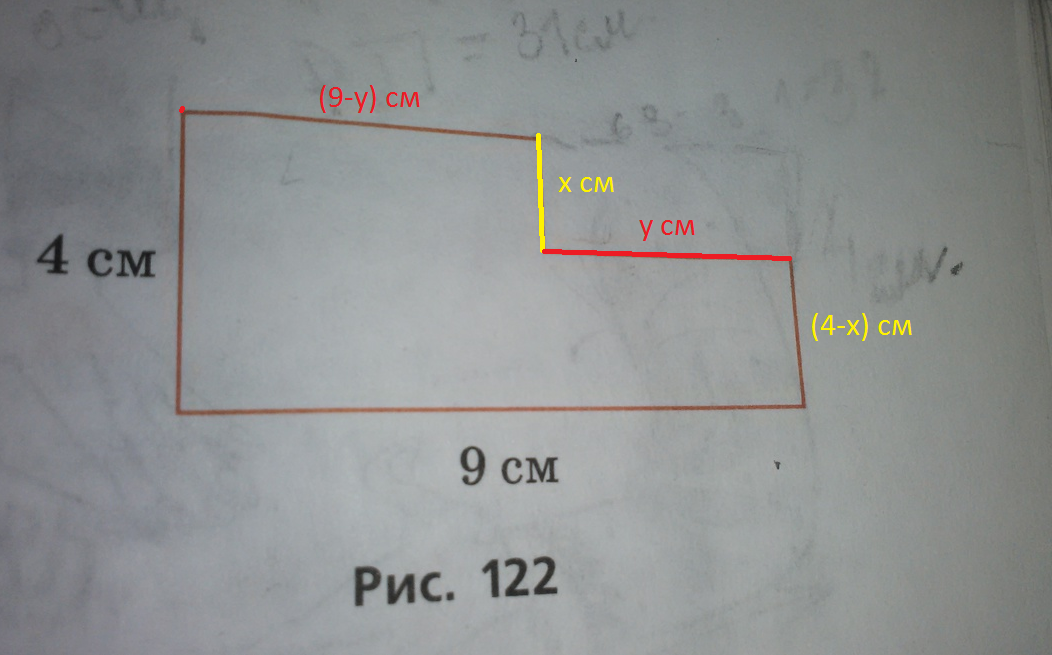 Р=4см +(9-у) см+х см+у см +(4-х) см +9 см= 4 +9+4+9=13+13=26 (см)