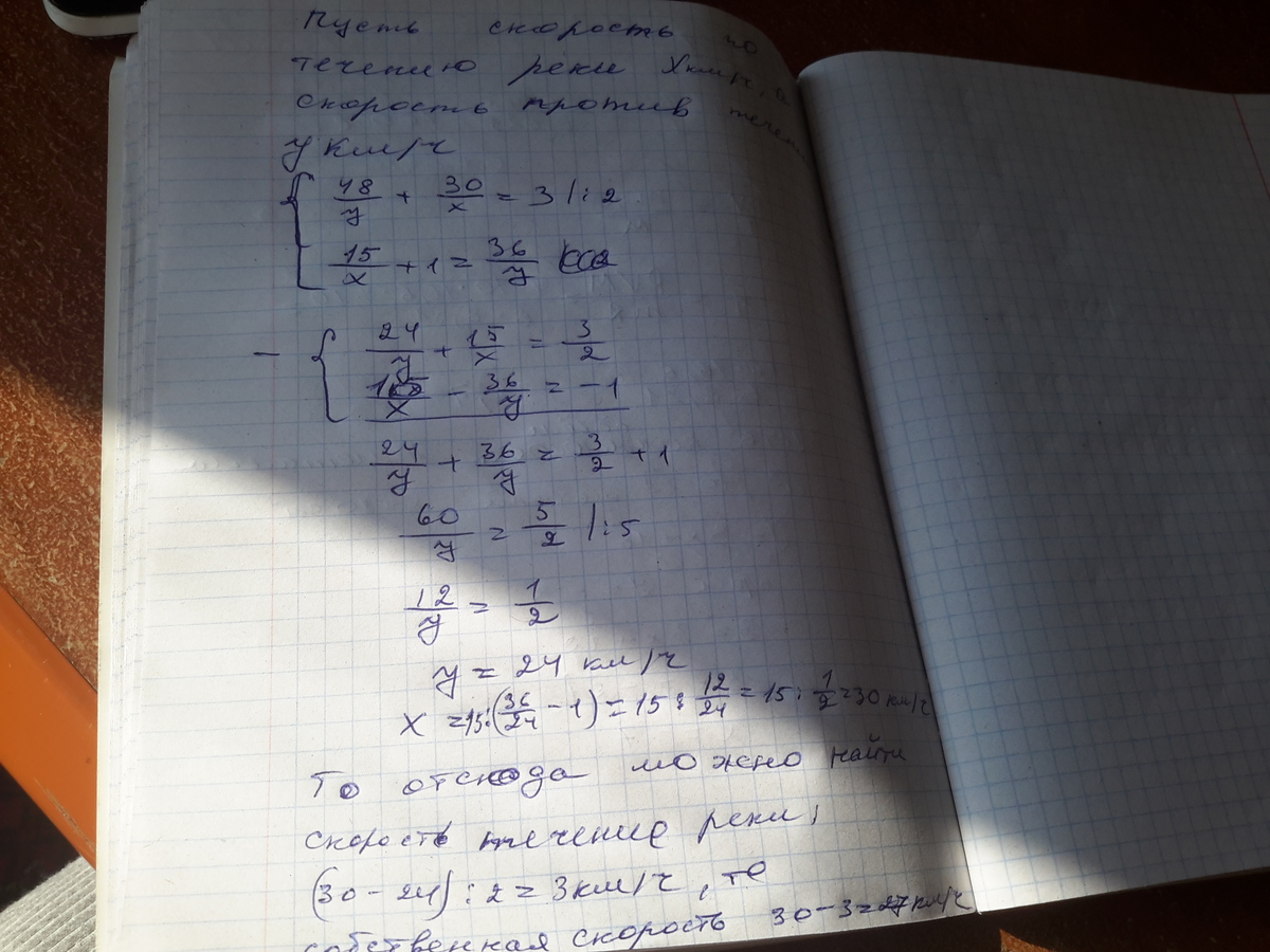 реки и 30 км по течению за 3 ч а 15 км по течению на 1 ч быстрее чем 36 против течения. найдите скорость катера и и скорость течения реки