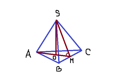 ОМ=1/3АМ=2 (т.к. высота пирамиды падает в центр вписанной и описанной окружности - точка пересечения биссектрис и медиан и высот так как треугольник правильный,и медианы пересекаются в одной точке и точкой пересечения делятся в отношении 2:1 считая от вершины)