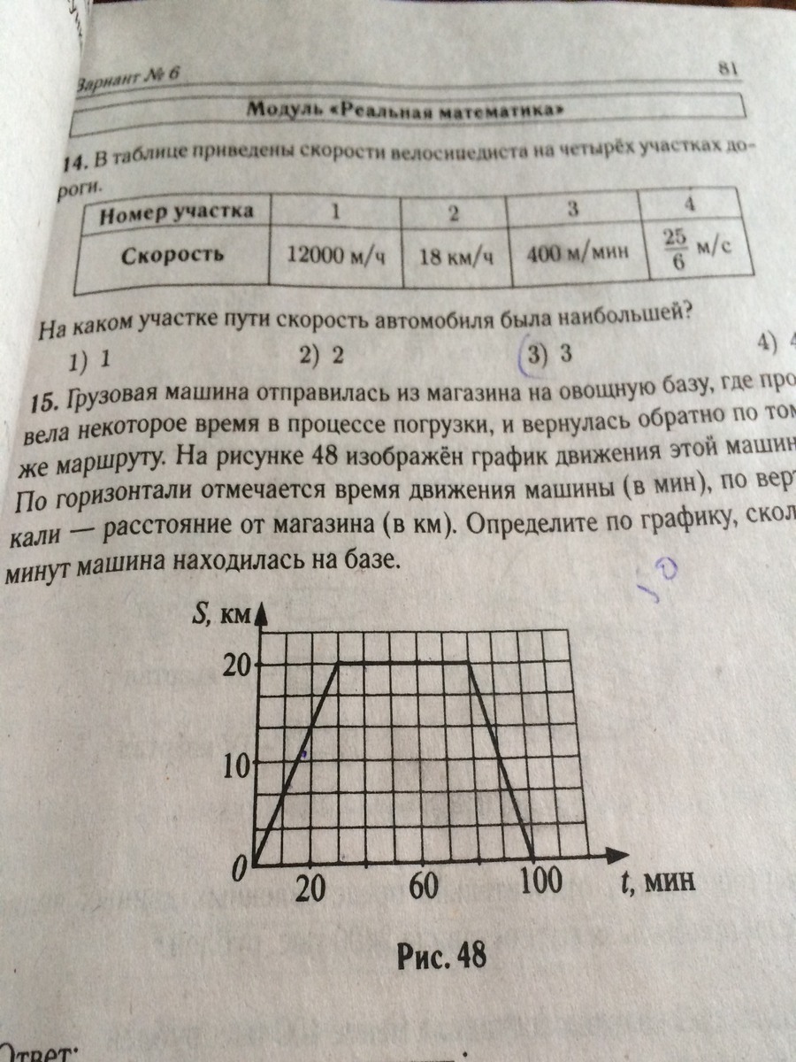 Грузовая машина отправилась из магазина на овощную базу,где провела некоторое время в процессе погрузки и вернулась обратно по тому же маршруту.На рисунке 48 изображен график движения в машине(в мин) ,по вертикали-расстояние от магазина в(в км).Определите по графику ,сколько минут машина находилась на базе.