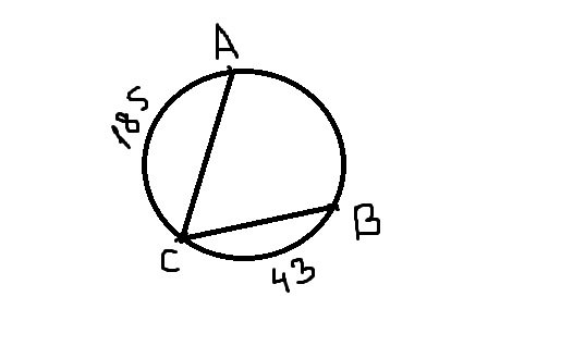 Дуга окружности AC,не содержащая точки B составляет 185 градусов.А дуга окружности BC,не содержащая точки A,состовляет 43 градуса.Найдите вписанный угол ACB.Ответ дайте в градусах.