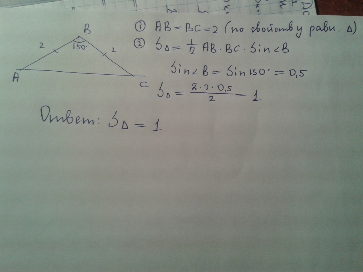 «угол при вершине противолежащей основанию равнобудренного треугольника равен 150 боковая сторона треугольника равна 2 найдите площадь этого треугольника»