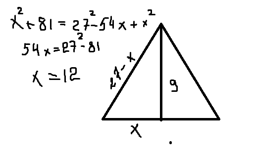 Найти стороны равнобедренного треугольника если его периметр равен 54 см,а высота,проведенная к основанию 9 см