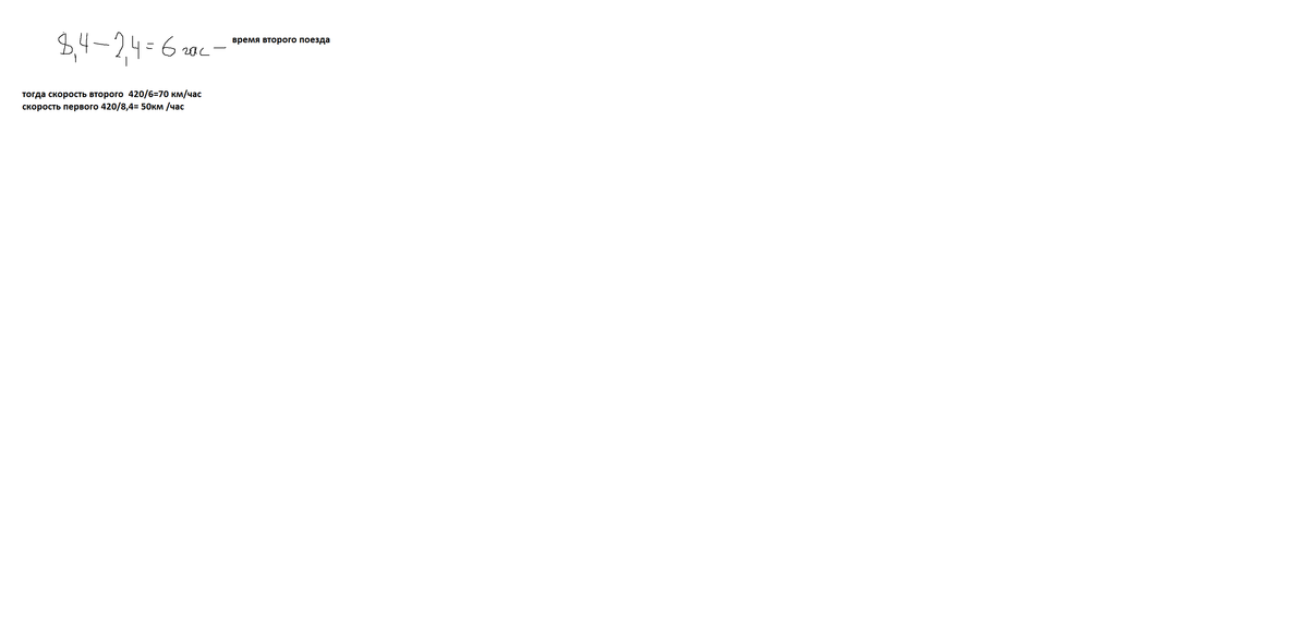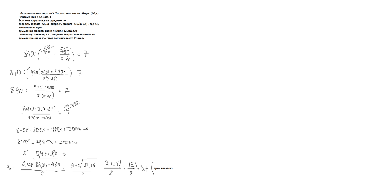 Из двух станций,расстояние между которыми равно 840 км,выехали навстречу друг другу два поезда и встретились на середине дороги,причем один из них выехал на 2 ч 24 мин позже другого.Если бы поезда выехали одновременно,то они встретились бы через 7 ч.Найти скорость каждого поезда.