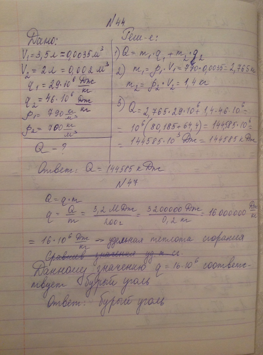 44.Какое количество теплоты получается при полном сгорании топлива,состоящего из смеси 3,5 л спирта и 2,0 л бензина.