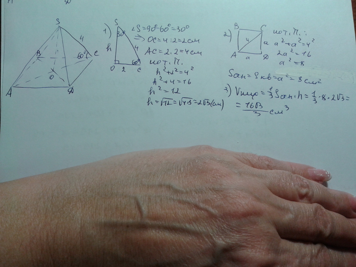 боковые ребра правильной четырехугольной пирамиды 4 см и состоит с плоскостью основания углом 60 градусов .найти объем
