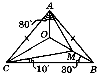 В равнобедренном треугольнике ABC с основанием BC угол при вершине A равен 80o. Внутри треугольника ABC взята точка M так, что MBC = 30o и MCB = 10o. Найдите величину угла AMC.