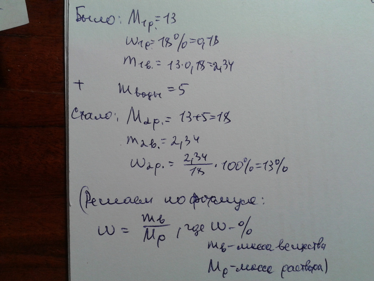 В сосуд, содержащий 13 литров 18%-го водного раствора некоторого вещества, добавили 5 литров воды. Найдите концентрацию получившегося раствора.