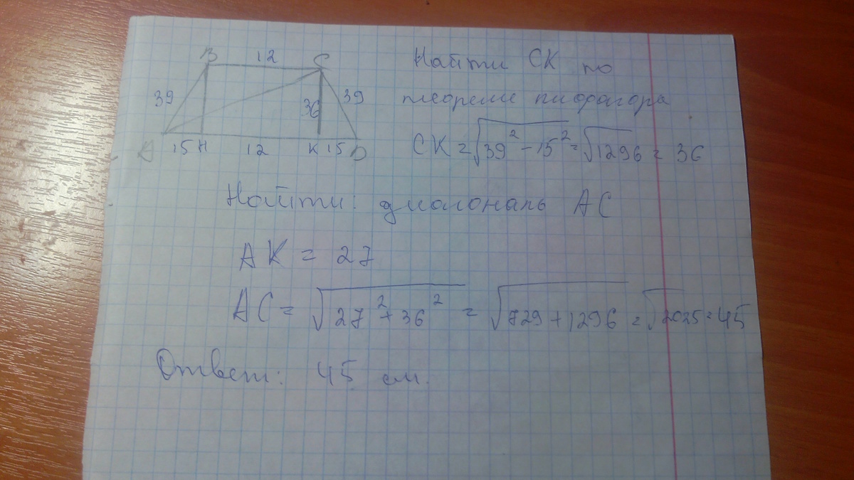 основания равнобедренной трапеции равны 12 и 42 , боковая сторона равна 39 . найдите длину диагонали трапеции