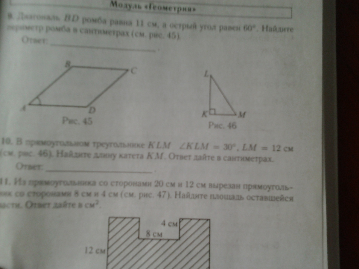 номер 10 . В прямоугольной треугольнике KLM угол KLM =30°, LM =12см(см. рис. 46).Найдите длину катета KM. Ответ дайте в сантиметрах.