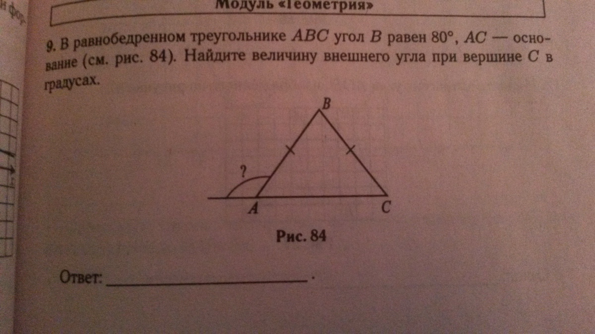 в равнобедренном треугольнике ABC угол B равен 80 градусов, AC- основание. Найдите величину внешнего угла при вершине C в градусах