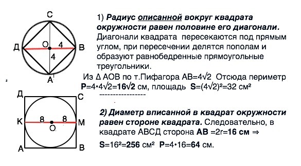 1) Радиус описанной вокруг квадрата окружности равен половине его диагонали. Диагонали квадрата пересекаются под прямым углом, при пересечении делятся пополам и образуют равнобедренные прямоугольные треугольники.