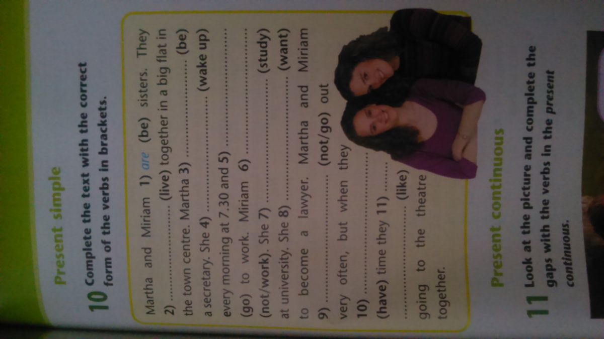 "Martha and Mariam are sisters.They are live together in a big flat in the town center.Martha is a secretary.She wakes up at 7.30 and goes to work.Mariam doesn`t work.She studies at university.She wants to become a lawyer.Martha and Mariam are don`t go out very often but they have time they like going to theatre