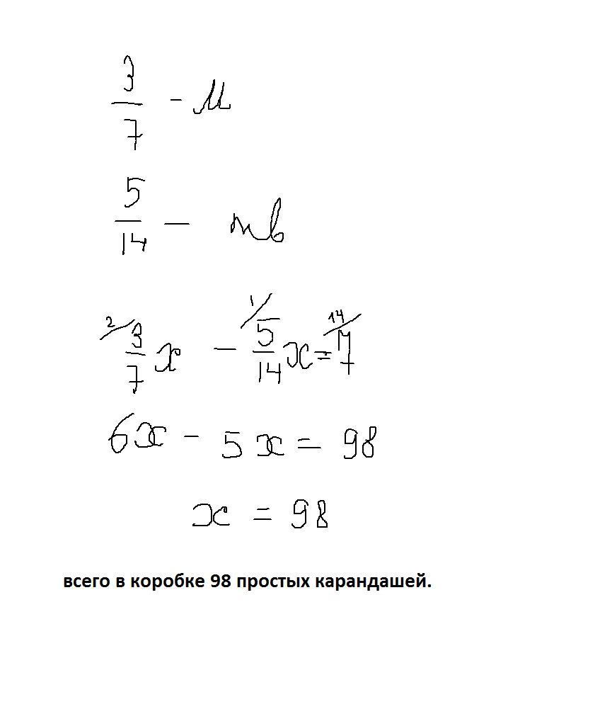 В коробке 3 седьмых всех простых карандашей составляют мягкие и 5 14 - тых всех карандашей - твёрдые . Сколько простых карандашей в коробке , если мягких на 7 больше