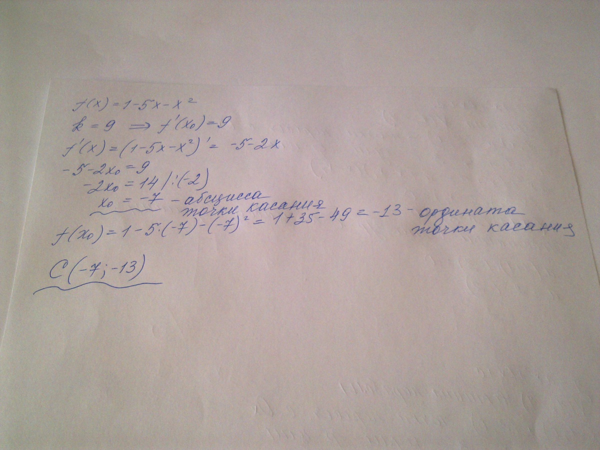 к графику функции f(x)=1-5x-x^2 проведена касательная с угловым коэффициентом 9. Найдите координаты точки касания С решением пожалуйста