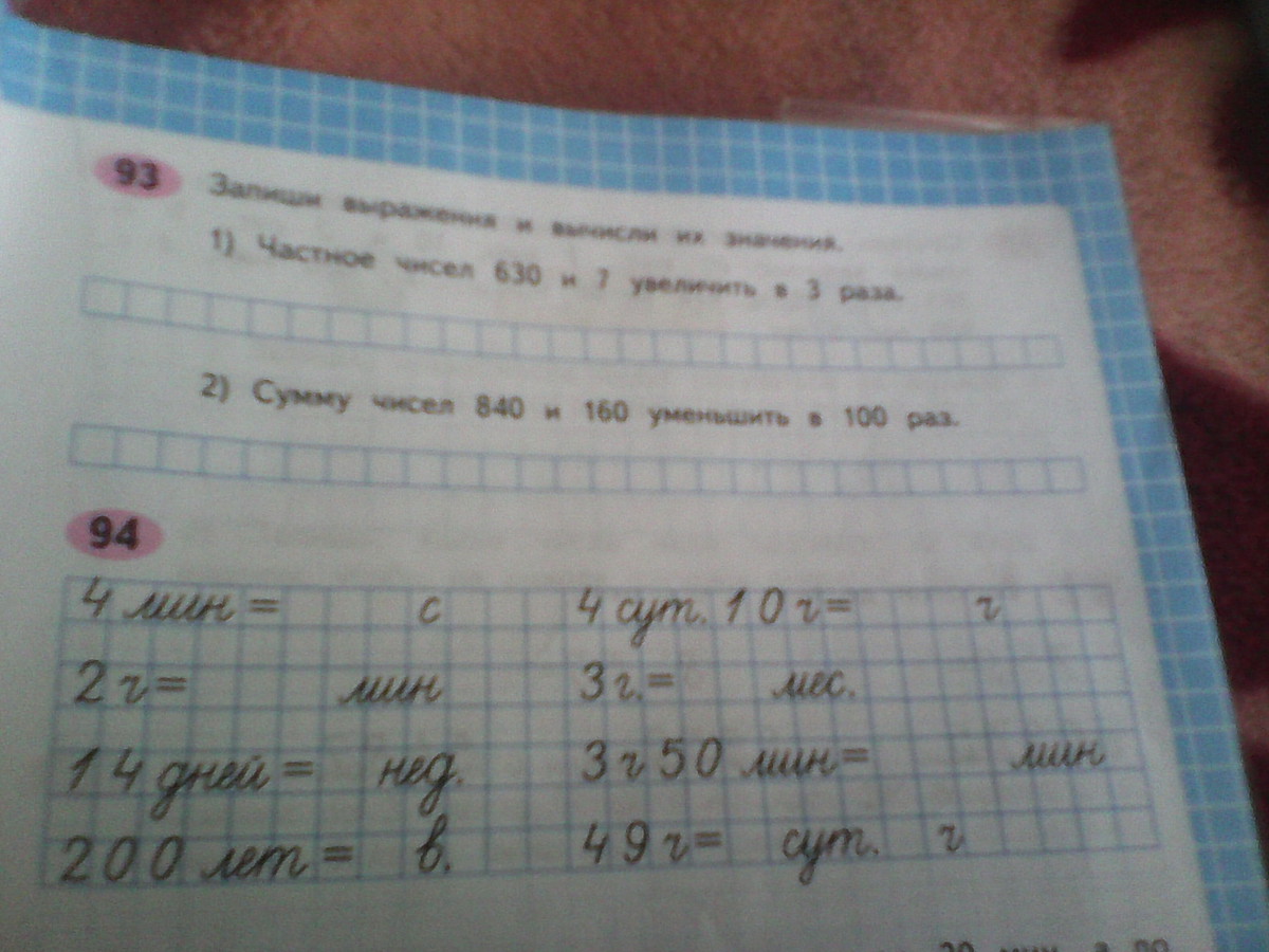 №93 (630-7)*3=623*3=1869 840+160=1000*100=100000 №94 4мин=240сек 2ч=120мин 14дн=1нед 200лет=2век 4сут10час=96+10=106 час 3г=36мес 3ч50мин=180+50=230мин 49час=2сут1час