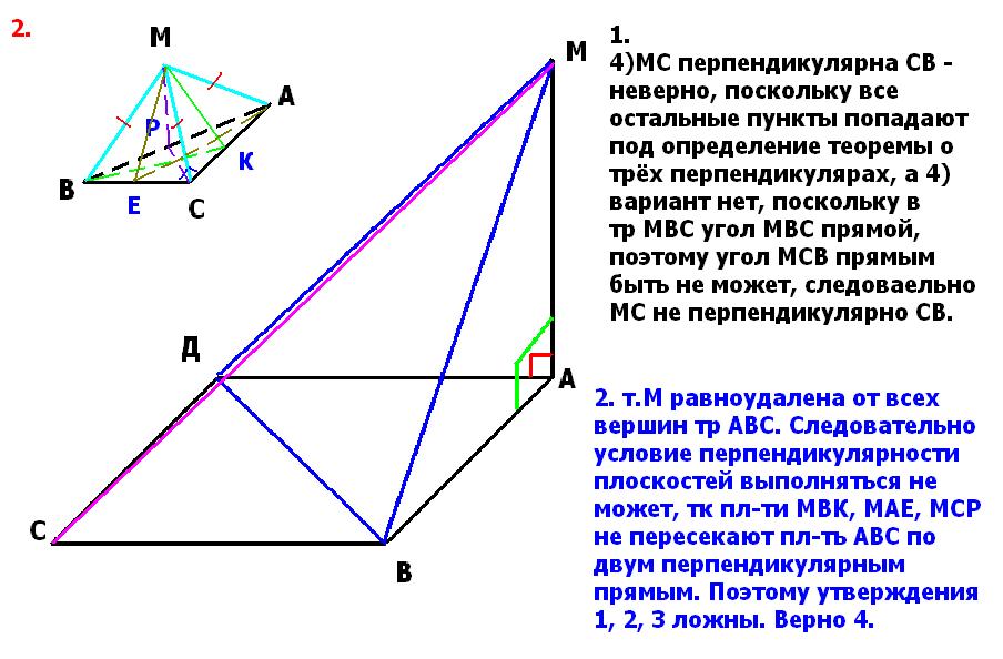 2)Расстояния от точки"М" до вершин прямоугольного треугольника АВС(угол С -прямой)равны. какое из данный утверждений ВЕРНО(и почему?)