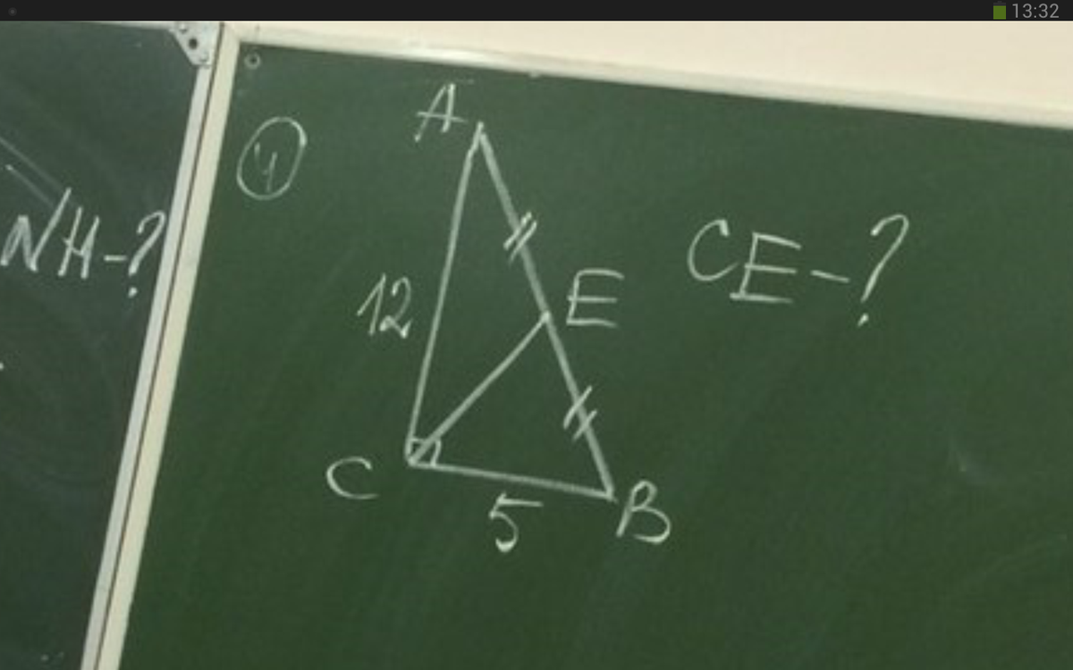 Треугольник АВС прямоугольный, угол С=90°, АС=12, СВ=5, АЕ=ЕВ. Найти - СЕ.
