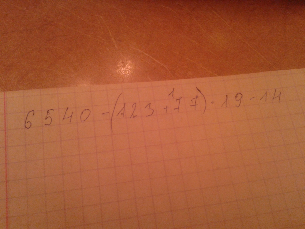 6540 - (123+77) ×19 - 14 = 2726 1) 123+77 = 200 2) 200×19 = 3800 3) 6540-3800=2740 4) 2740-14=2726