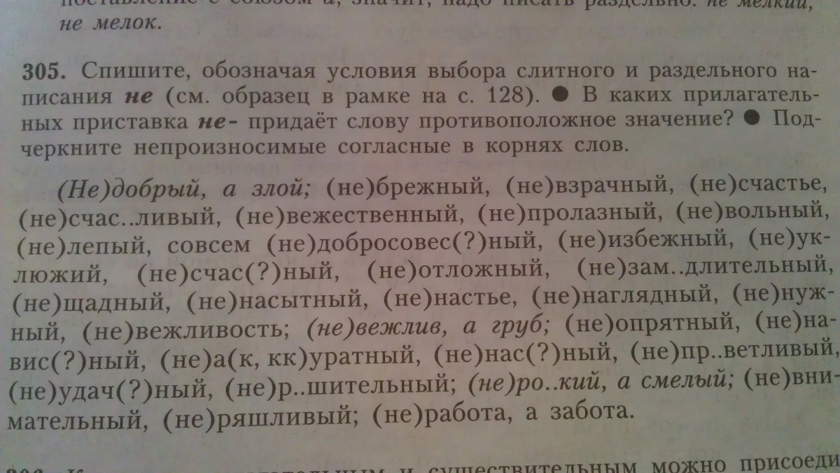 Не добрый, а злой ( противопоставление); небрежный( без не не употр.), невзрачный( без не не употр.), несчастье ( отсутствие счастья), несчасТливый, невежественный( без не не употр.), непролазный, невольный, нелепый( без не не употр.), совсем не добросовестный, неизбежный( без не не употр.), неуклюжий( без не не употр.), несчасТный, неотложный, незамедлительный, нещадный, ненасытный( без не не употр.), ненастье, ненаглядный, ненужный, невежливость, не вежлив, а груб( противопоставление), неопрятный, ненависТный, неаккуратный, ненасТный( без не не употр.), неприветливый, неудачный, нерешительный, не робкий, а смелый( противопоставление), невнимательный, неряшливый( без не не употр.), не работа, а забота( противопоставление).
