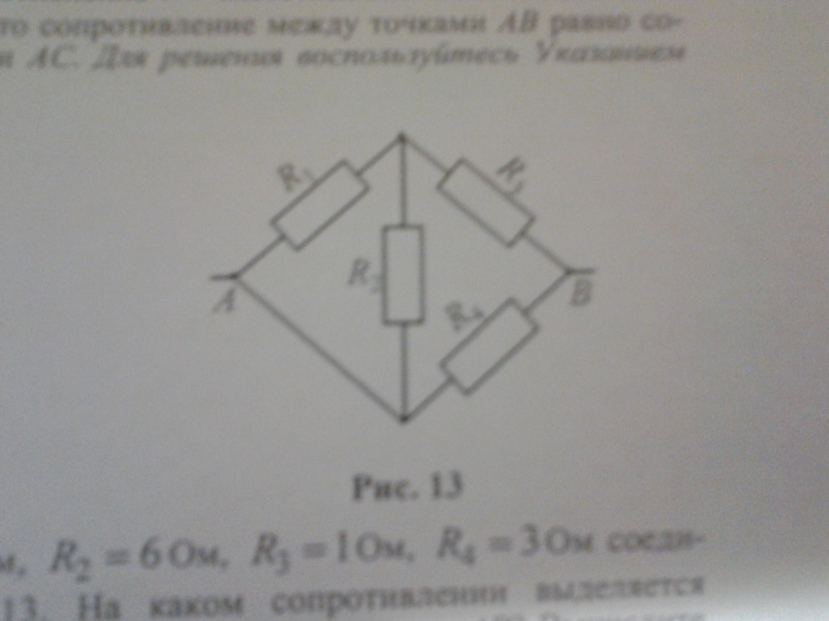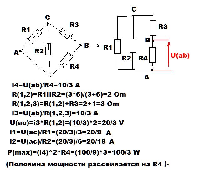 Сопротивления R1 = 3 Ом, R2 = 6 Ом, R3 = 1 Ом, R4 = 3 Ом соединены как показано на рис 13. На каком сопротивлении выделяется наибольшая мощность при подаче напряжения на клеммы AB? Вычислите эту мощность Pmax, если U AB = 10 B.