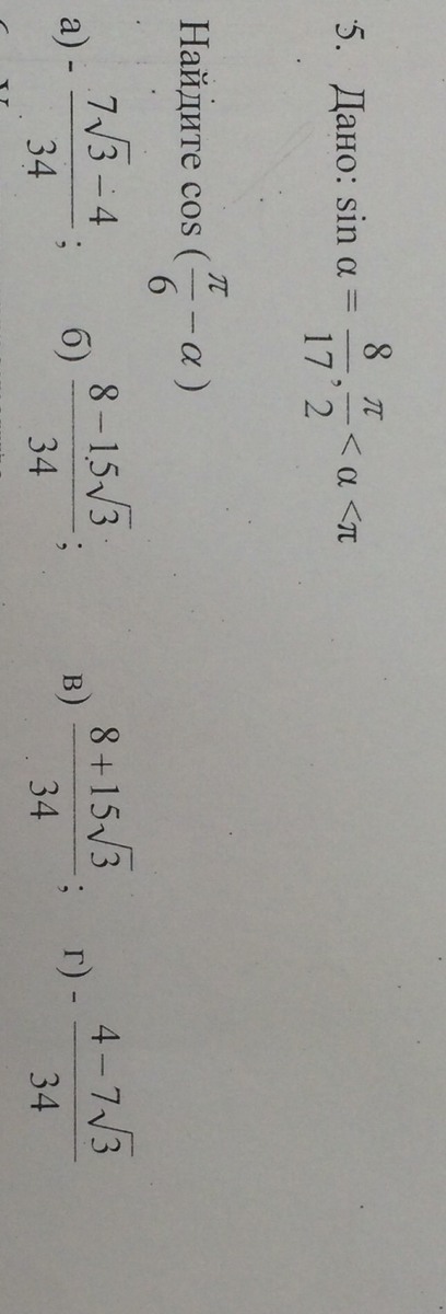 cos(π/6-α)=√3/2·-15/17)+1/2·8/17=-15√3/34+8/34=(8-15√3)/34;