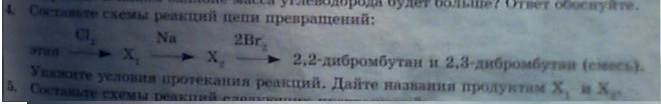 этан Cl2........=X1..........Na=X2.........2Br2=2,2-дибромбутан и 2,3-дибромбутан (смесь).