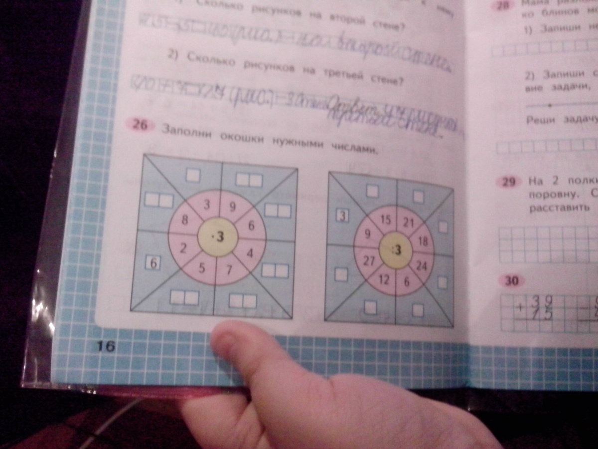 в первом круге, нужно умножать 3*2=6 и т.д. заполняя каждую графу, во втором круге нужно делить 9:3=3 и т.д.