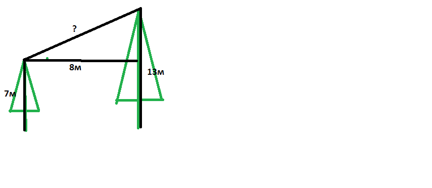 один катет =8, второй(13-7)=6, по теореме Пифагора, где квадрат гипотенузы равен сумме квадратов катетов, находим 36+64=100, корень из 100=10, гипотенуза, то есть расстояние между вершинами=10 метрам.Во.