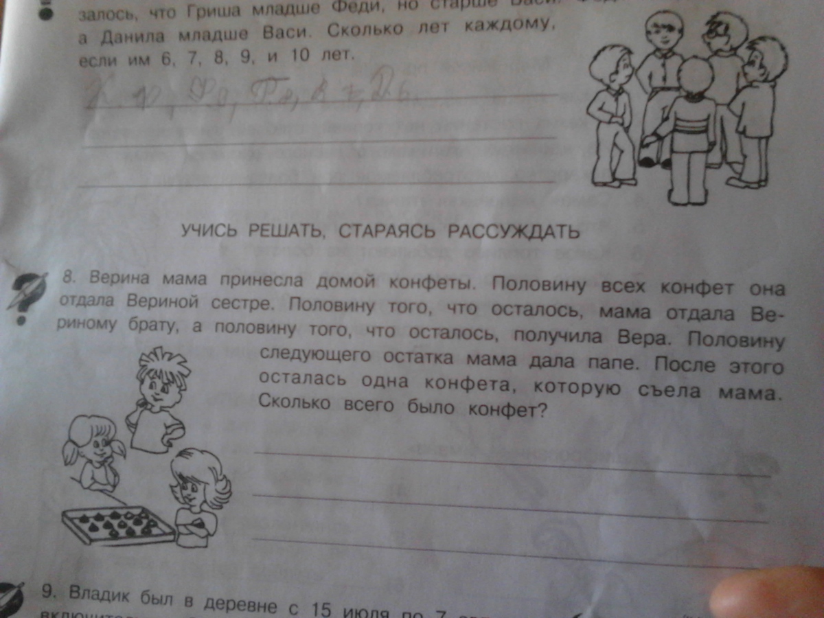 верина мама принесла домой конфеты. половину всех конфет она отдала вериной сестре. половину того, что осталось, получила вера.