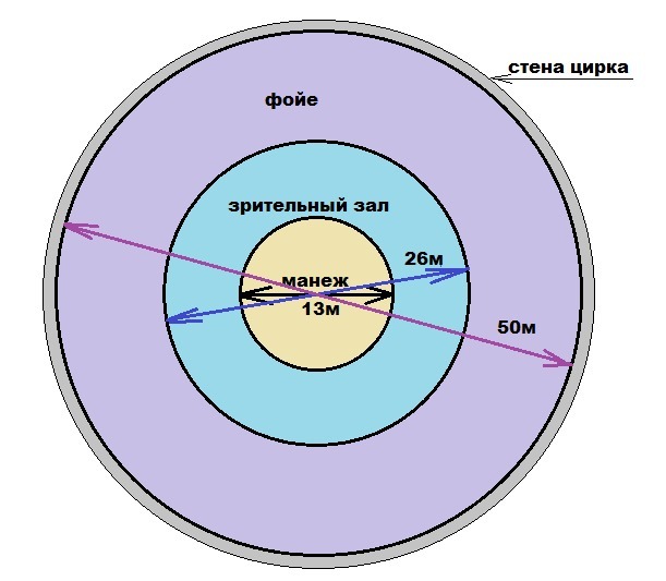 радиус зрительного зала цирка в 2 раза больше радиуса манежа и на 12м меньше радиуса фойе. узнай чему равен диаметр здания цирка. сделай рисунок