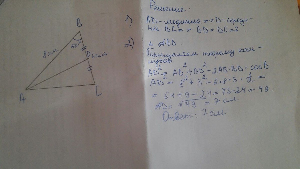 В треугольнике ABC AB=8 см, BC=6 см и угол B=60°. найти длину медианы AD.