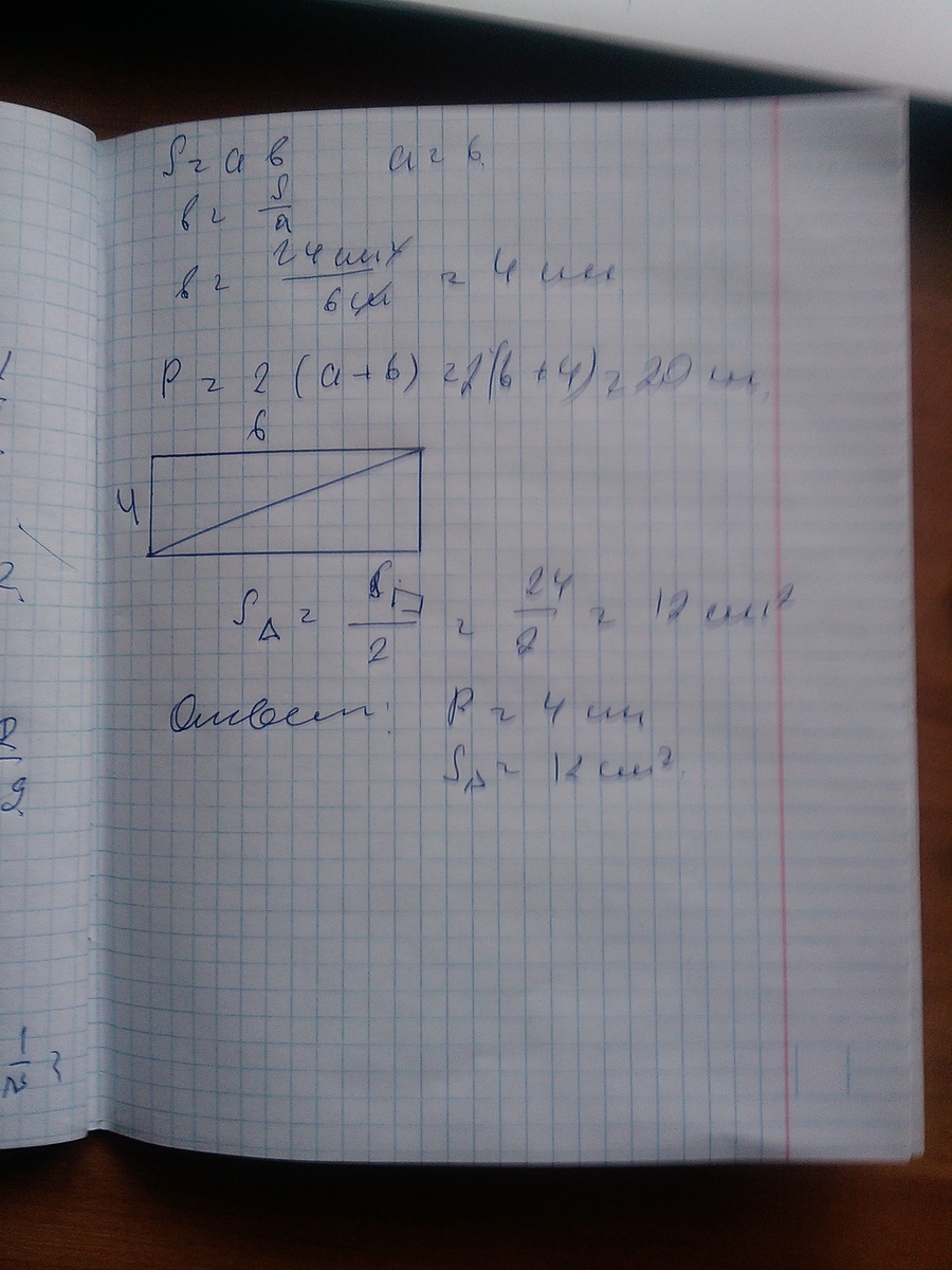 Площадь прямоугольника - 24 см2, длина - 6 см.Найди его периметр.Начерти прямокгольник в тетради. Соедини две противопложные вершины прямоугольника.Какик фигуры у тебя получились? ? Найди их площадь.
