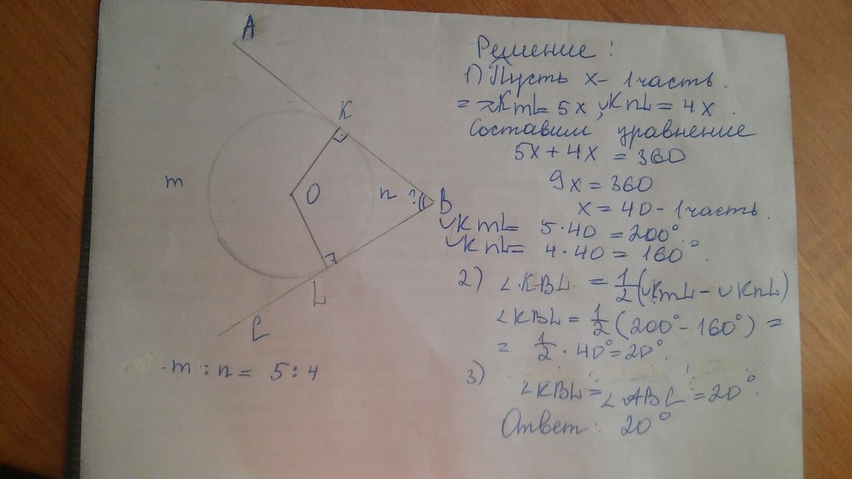 В угол АВС описана окружность.Точки касания делят окружность на дуги, градусные величины которых относятся как 5:4.Найдите величину угла АВС