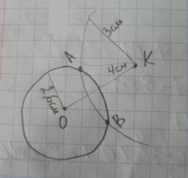Начертите окружность с центром O и радиусом 2 см 6 мм. Отметьте такую точку К, чтобы ОК=4 см. Найдите с помощью циркуля на окружности точки, удаленные от точки К на 3 см.