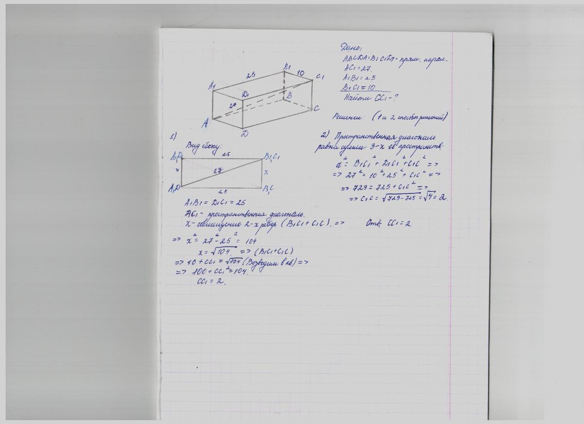 в прямоугольном параллелепипеде abcda1b1c1d1 известно что ас1=27 a1b1=25 b1c1=10.Найдите длину ребра сс1