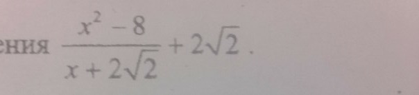 frac{x^{2} -8}{x+2 sqrt{2} } +2sqrt{2} }=frac{x^{2} -8+2sqrt{2}(x+2 sqrt{2}) }{x+2 sqrt{2} }=frac{x^{2} -8+2sqrt{2}x+8) }{x+2 sqrt{2} }= frac{x(x+2 sqrt{2})}{x+2 sqrt{2}} =x