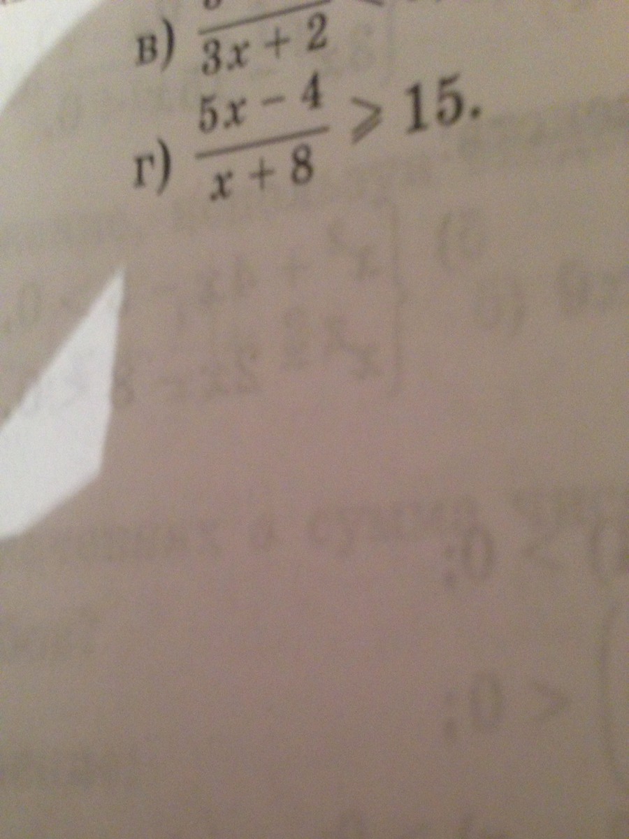frac{5x-4}{x+8}  geq 15 \  frac{5x-4}{x+8}  -15 geq 0 \  frac{5x-4-15x-120}{x+8} geq 0 \ frac{-10x-124}{x+8} geq 0 \  left { {{-10x-124 geq 0} atop {x+8 neq 0}} right.  \ left { {{-10x geq 124} atop {x neq -8}} right. \  left { {{x leq -12.4} atop {x neq -8}} right.